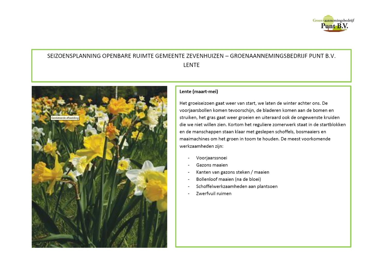 Voor Zevenhuizen is een planning opgesteld gericht op werkzaamheden in de buitenruimte; integraal onderhoud Zevenhuizen. Middels de planning krijgt u inzicht in de huidige werkzaamheden in Zevenhuizen alsmede de planning voor de aankomende periode.